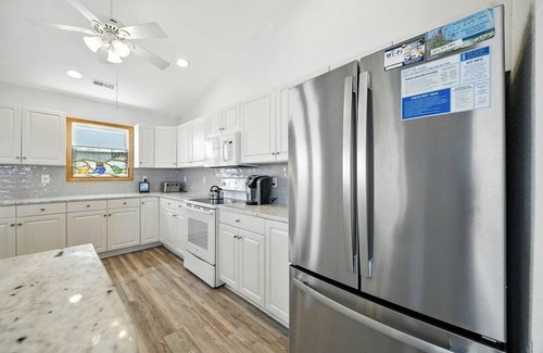 "Three Little Birds" is an absolutely lovely South Nags Head beach cottage outfitted with your comfort and enjoyment in mind! The private pool is actually 'private': This property is located right on the border of the National Park Service preserve. Ocean views from the front deck, along with the ocean breezes will lull you into that 'island feeling' over your morning coffee. Beautifully furnished and EVERY BEDROOM HAS ITS OWN PRIVATE BATHROOM! Family-friendly with a huge 75" TV for movie night in the Great Room, and room for the kids to relax in the den. Enjoy your family meals on the screened porch with relaxing ocean views. Relax in the hot tub under a starry sky. Beach access is very close to make it an easy walk with children. For the fishermen in the group, the Outer Banks Pier is just a quick walk down the street. Located in South Creek Acres on a quiet service road, the community pool, and tennis courts are located close by! At "Three Little Birds" you are in another world of quiet afternoons and beautiful days on the beach. Ready to go? Outlet shopping, water sports, pier fishing, restaurants, groceries, and much more are just 5 minutes away.