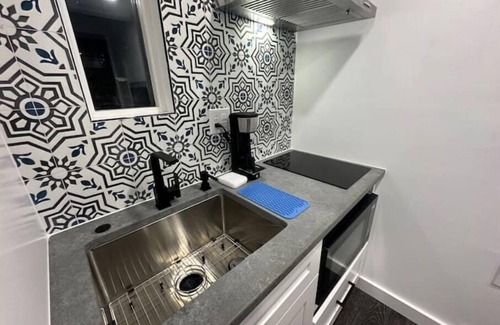 Gorgeous sky lights, vaulted ceilings, and an open floor plan make this unique 1 BR/1BA feel cozy, calm, and inviting. Features a kitchen with fridge, stovetop, microwave and coffee machine, all-new furnishings and fixtures and a queen bed.