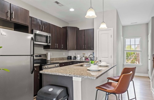 Stay in style in the eclectic city, home to the 2nd largest banking center in the USA—Charlotte! This classy 1696 sq. 3-bedroom & 2.5 bathroom Townhouse features 1 King bed and 4 Full beds for your comfort, Lightning Fast Wifi, a Convertible Sleeper Couch, a Fully Equipped Kitchen, and other Luxury Amenities—specially designed for your longer-length stays! Step out to a lively neighborhood, minutes from Uptown Charlotte—steps to restaurants, cafés, bars, and shops!