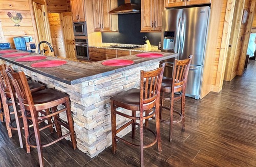 The main level features an open-concept living area with a cozy stone fireplace with gas logs, inviting you to relax while enjoying the panoramic views. The fully equipped kitchen boasts stainless steel appliances, granite countertops, and a spacious island with seating for six, perfect for casual meals or morning coffee. A dining area with seating for eight provides the perfect setting for family dinners. The master suite on this level offers a luxurious king bed, large flat-screen TV, and an en-suite bathroom complete with a soaking tub and a step-in shower with a rain head. Step outside to expansive covered and uncovered decks, where you can take in the fresh mountain air and admire the picturesque surroundings.