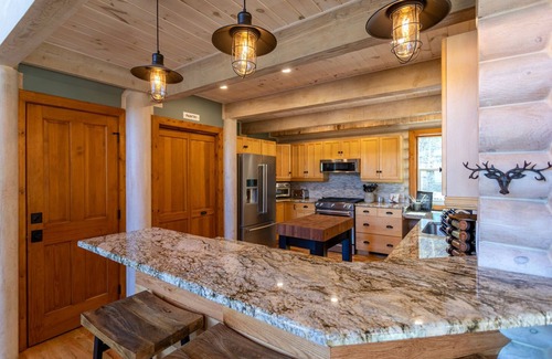 The dining table seats eight, with room for three more at the kitchen bar. The kitchen has all new stainless steel appliances, granite counters, a wooden island, a gas range, and a Keurig for your coffee. The kitchen is stocked with all the comforts of home to include bakeware, a crockpot, air fryer, InstaPot, extendable s'mores sticks for those cool nights by the fire, and much more!